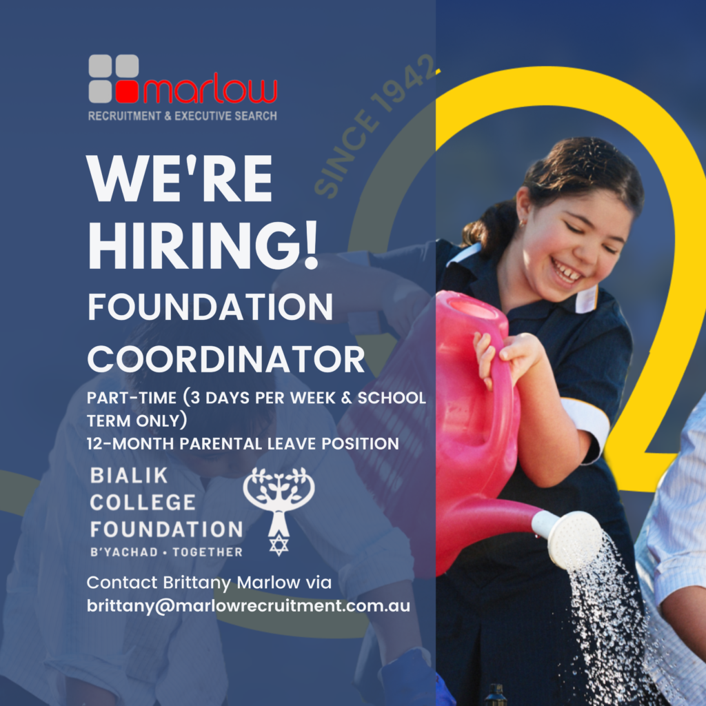 We are looking for an organised, proactive team player to join the Bialik College Foundation as their Foundation Coordinator (part-time, 3 days a week during school terms).